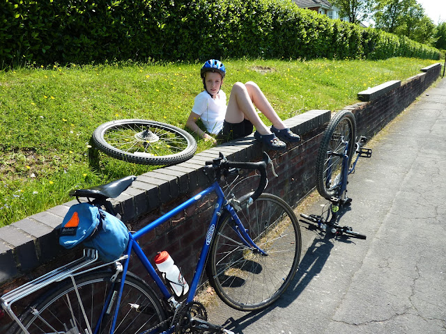 Even before we left home, there was a flat tyre on Hannah’s bike. I fixed it but not well enough, I didn’t put the patch in the right place! Just 2 miles from home, the tyre was again flat and here we are fixing it.